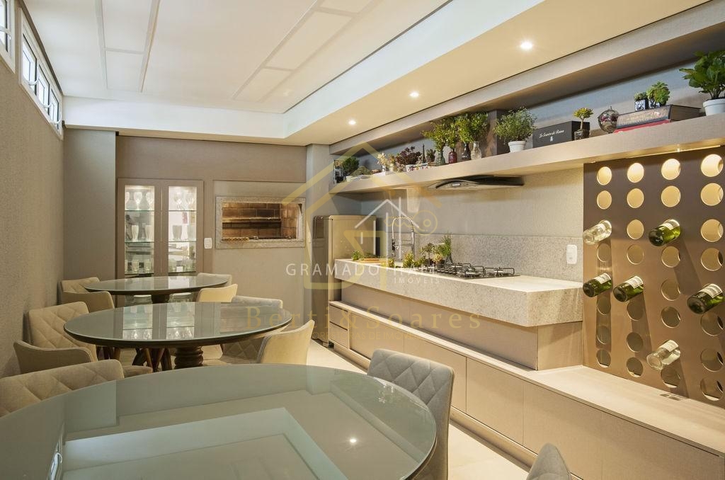 Conta com acabamento em gesso, piso laminado e porcelanato, churrasqueira, espera para lareira, infraestrutura para ar-condicionado split, espera para água quente, esperas para calefação e tubulação para ar-condicionado.