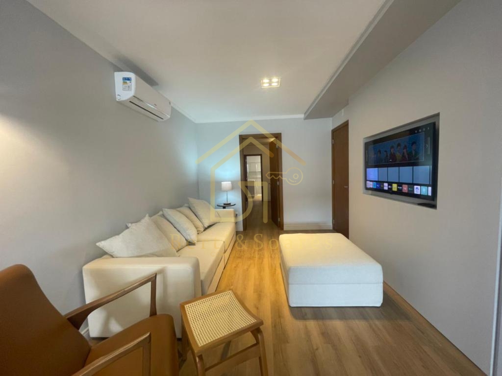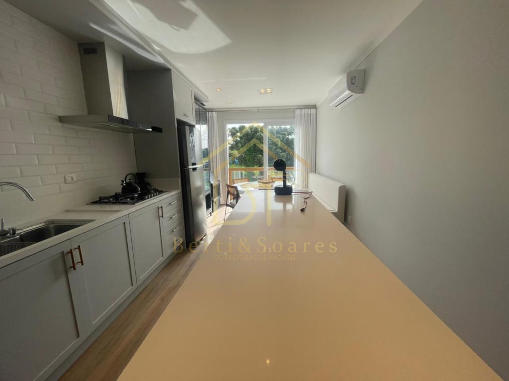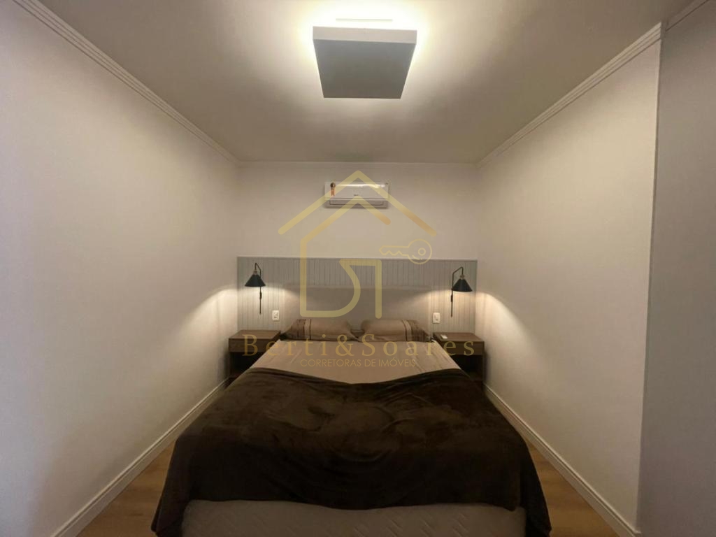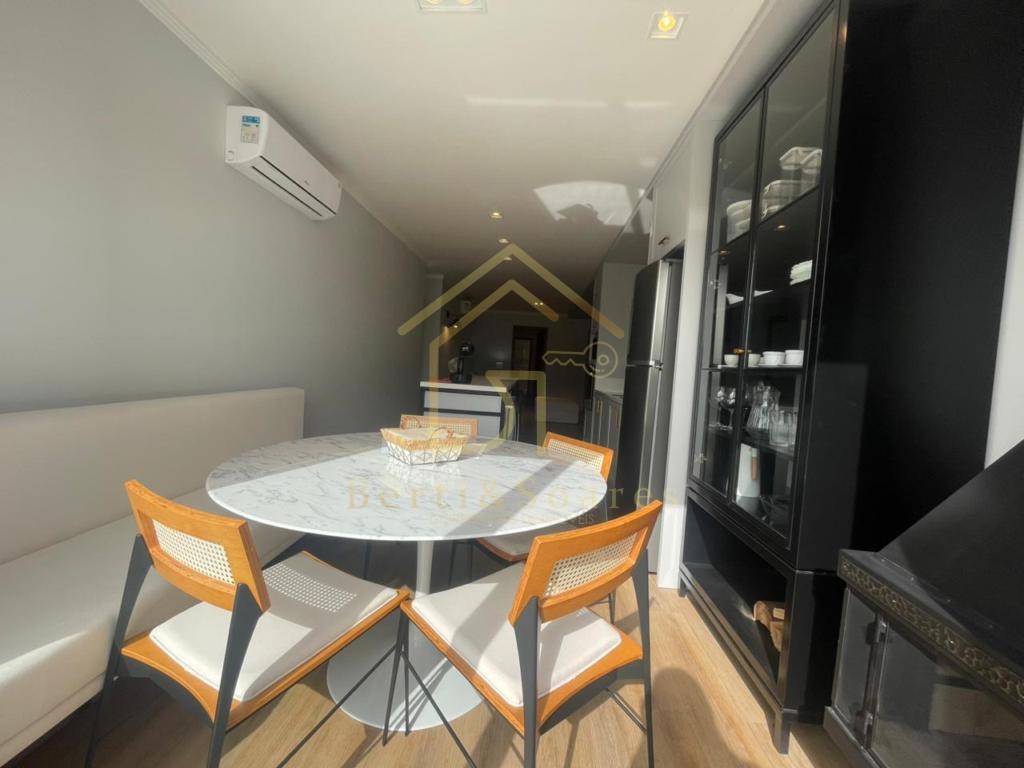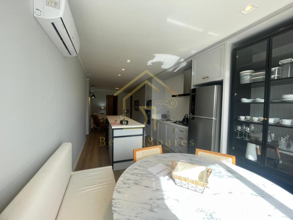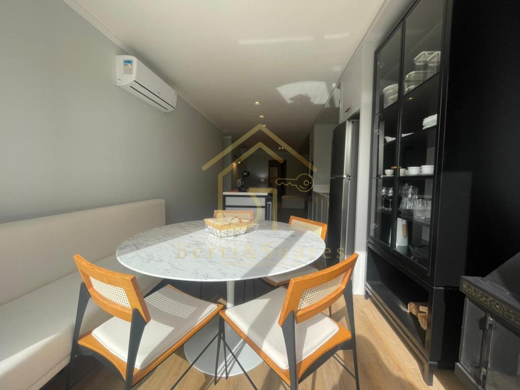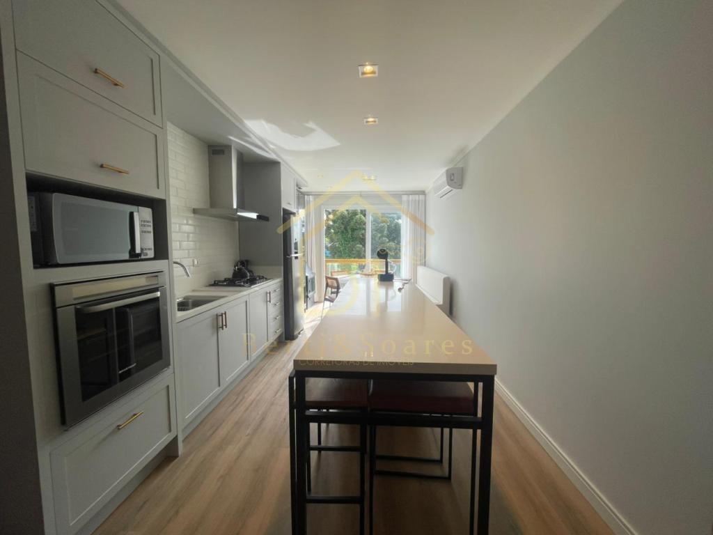 O imóvel possui dois dormitórios, sendo uma suíte + amplo living com dois ambientes, lareira, sacada e cozinha americana, proporcionando praticidade e integração. Conta também com banheiro social, área de serviço, lavanderia e garagem. Está completamente mobiliado, com móveis fixos e armários embutidos, além de ótima posição solar, gás individual, interfone e split, garantindo conforto em todas as estações do ano.